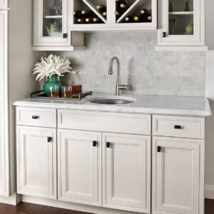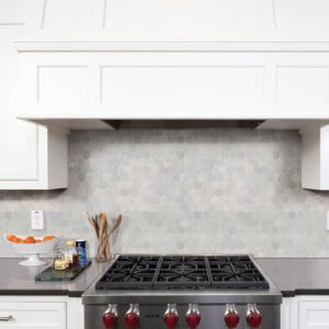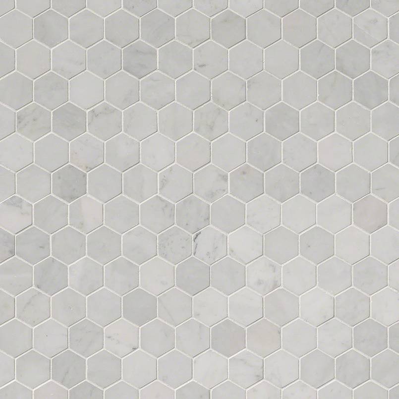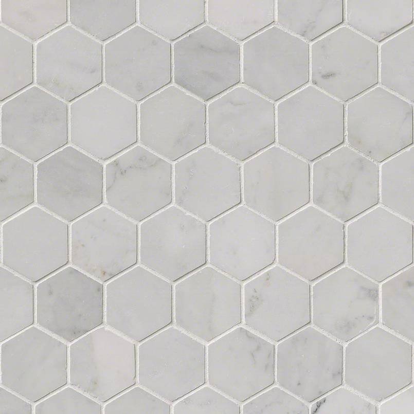 Carrara White Polished Hexagon Mosaic Tile features 42 generously sized chips per mesh-mounted sheet, with each hexagon measuring 2 inches. Imported from Italy, this honeycomb-inspired design is a modern take on timeless white marble, enriched by subtle gray veining for added character. Suitable for a wide range of residential and commercial applications, this versatile backsplash tile blends effortlessly with any design style.
