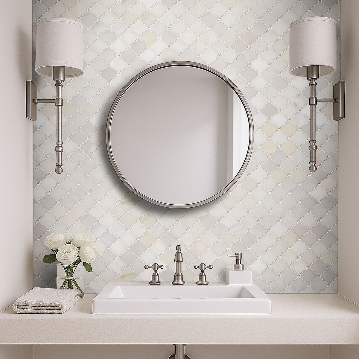 Greecian White Arabesque Tile showcases the timeless beauty of Italian marble with its graceful arabesque design. This opulent pattern brings drama and sophistication to interiors while complementing surrounding décor. Ideal for accent walls, kitchen backsplashes, and bathrooms, it arrives in mesh-mounted sheets for easy installation, making it a versatile choice for both classic and modern spaces.