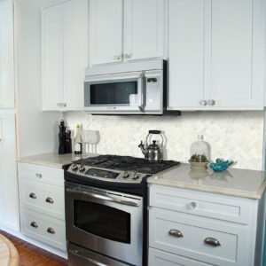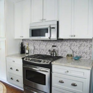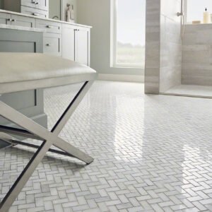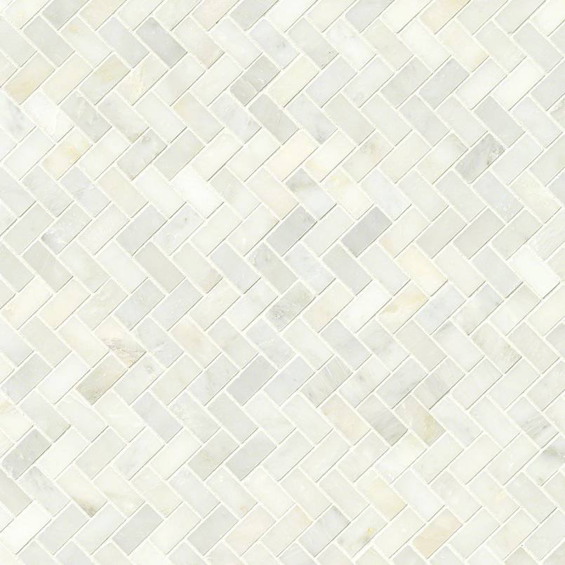 Greecian White Herringbone Tile is a polished marble mosaic featuring a crisp white base with soft smoky gray variations. Its semi-basketweave herringbone design adds movement and character, making it a striking choice for flooring, countertops, or kitchen backsplashes. Prearranged in mesh-mounted sheets, this natural stone tile delivers a seamless and stylish finish with every installation.
