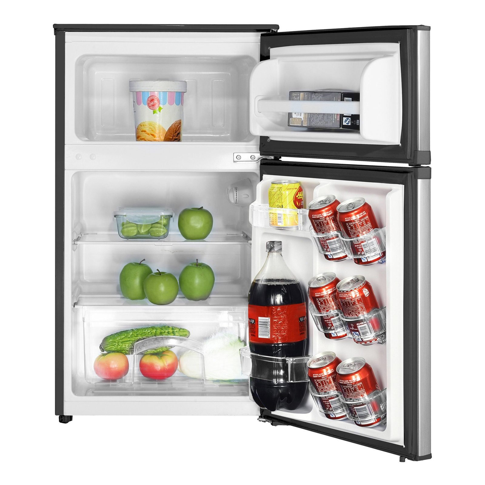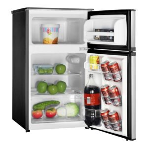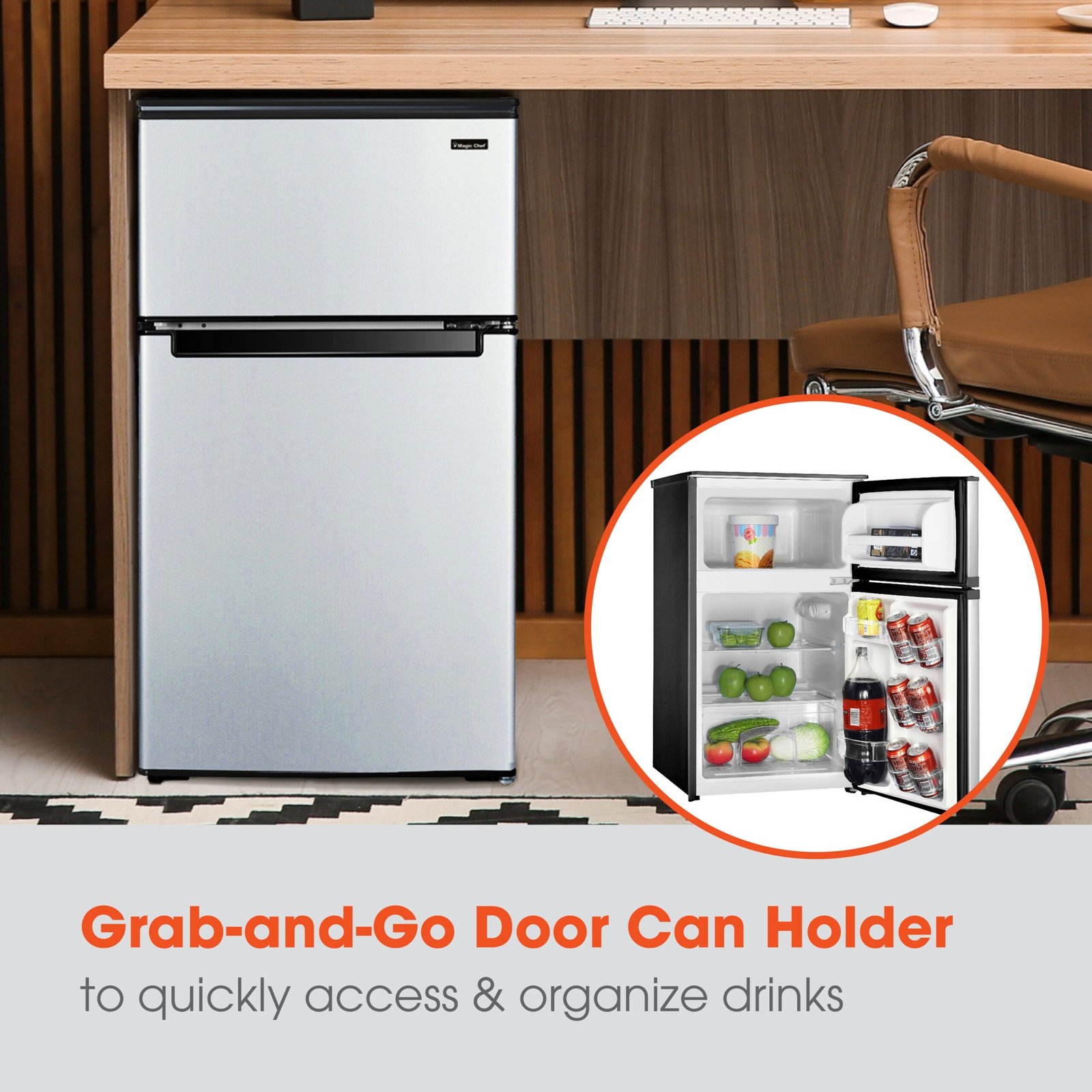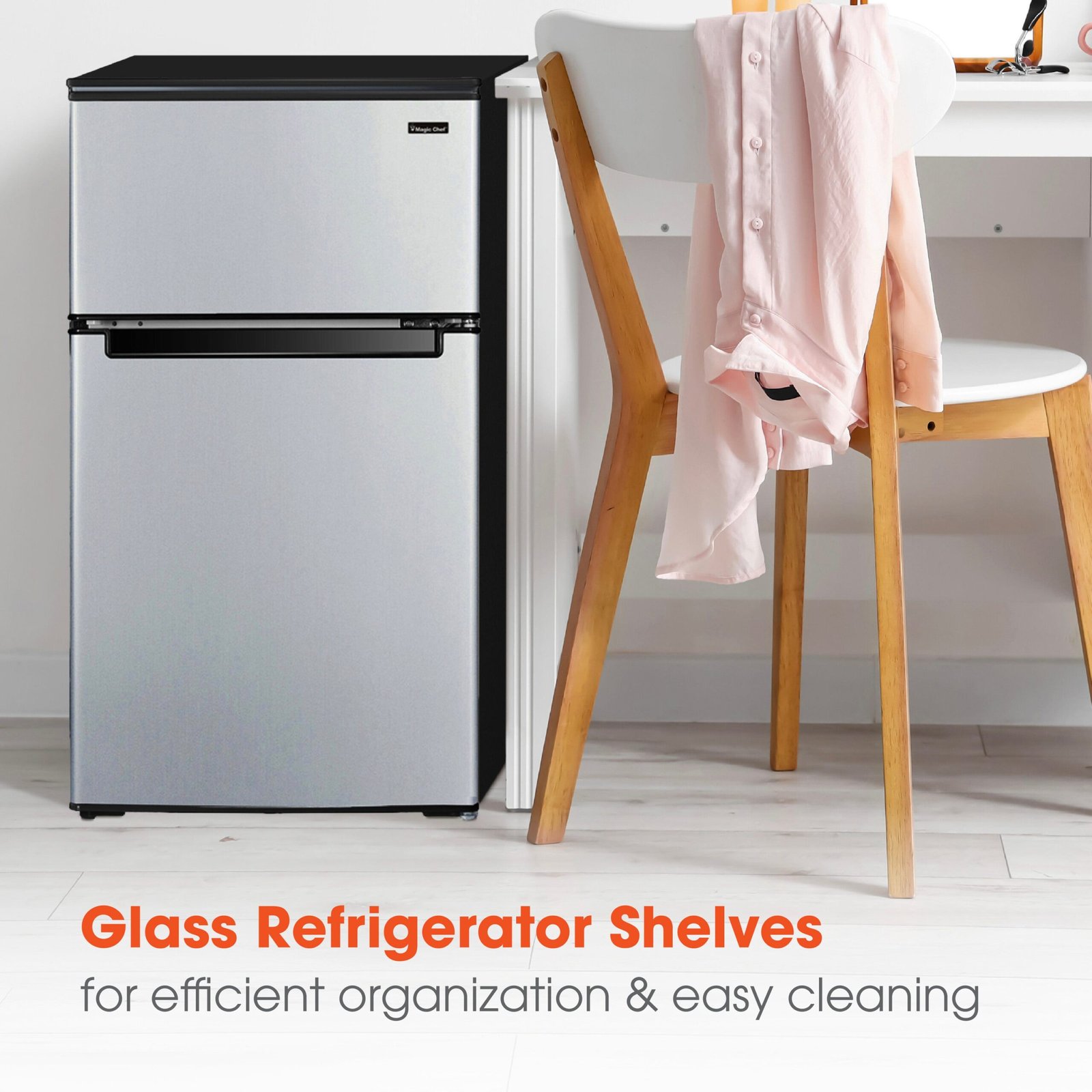 The perfect dorm, office, or bedroom fridge that actually has a real freezer. 3.1 cu.ft. total with a separate top-mount freezer, built-in can dispenser, spill-proof glass shelves, and a sleek stainless-look finish. Energy Star efficiency, reversible doors, and flush-back design make it a no-brainer for small spaces.