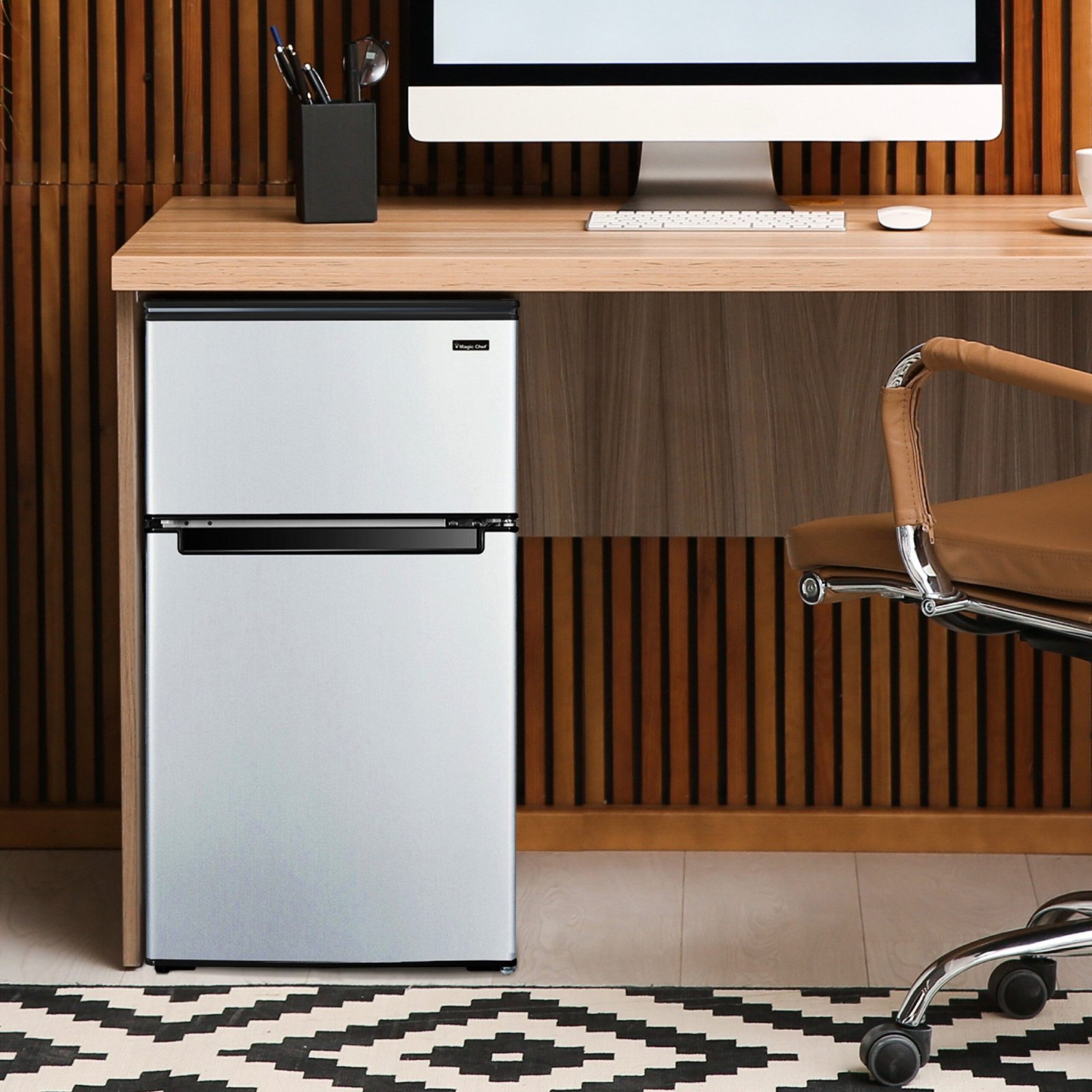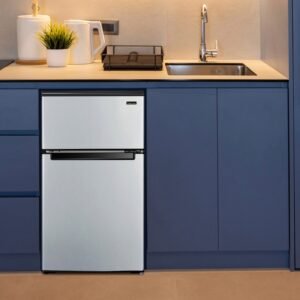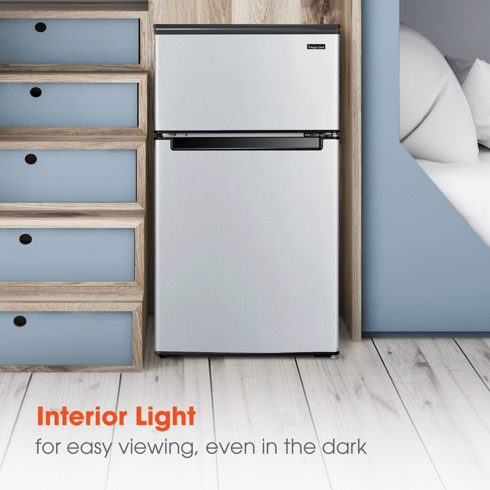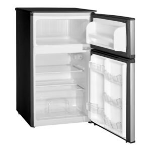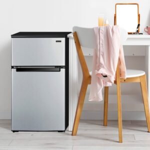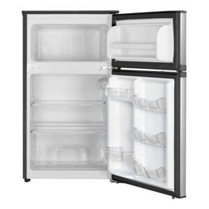 The perfect dorm, office, or bedroom fridge that actually has a real freezer. 3.1 cu.ft. total with a separate top-mount freezer, built-in can dispenser, spill-proof glass shelves, and a sleek stainless-look finish. Energy Star efficiency, reversible doors, and flush-back design make it a no-brainer for small spaces.