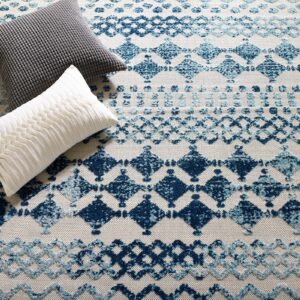 The Giada Distressed Vintage Abstract Diamond Moroccan Trellis Indoor and Outdoor Area Rug from the Reflect Collection combines elegance and durability with its abstract diamond and Moroccan trellis design. Made from 100% machine-woven polypropylene sisal, its tight low two-tier pile weave ensures a non-shedding, long-lasting surface, while the gripping rubber underside provides stability for high-traffic areas like patios, porches, decks, living rooms, bedrooms, kitchens, or dining rooms. Available in two sizes—90.5″D x 63″W x 0.5″H (SKU: EST-R-1178A-58) and 122″D x 94.5″W x 0.5″H (SKU: EST-R-1178A-810)—this fade- and stain-resistant rug is easy to maintain with periodic vacuuming or hosing down. Pet- and family-friendly, it creates a safe, contemporary play area for kids and pets while protecting floors from spills and heavy furniture, making it a stylish, carefree addition to both traditional and modern decor.