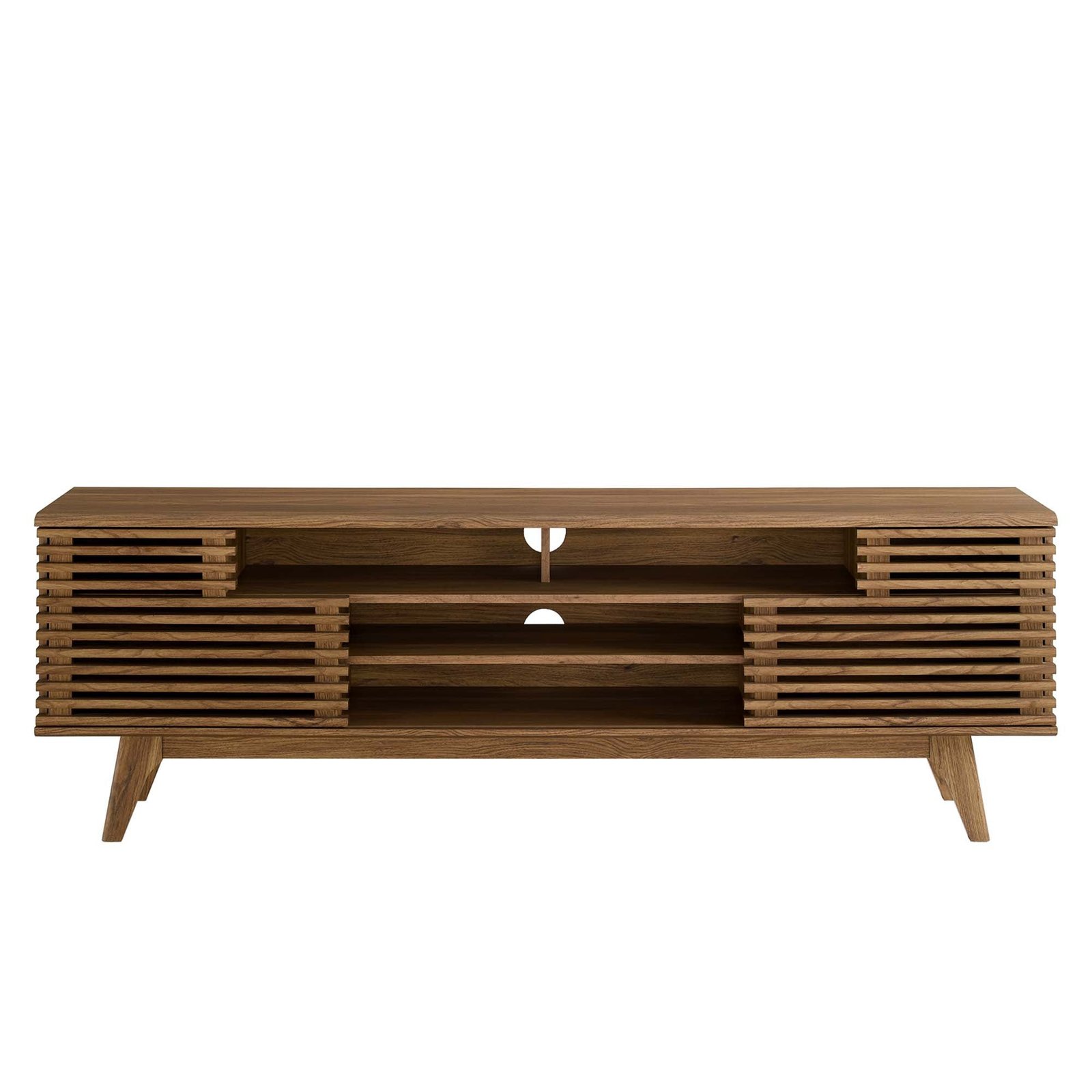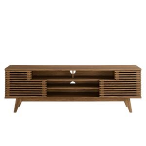 Render 71″ Media Console TV Stand brings mid-century modern elegance to your living room with its sleek design and robust functionality. Crafted from a durable particleboard and MDF frame with smooth wood grain laminate, this entertainment centre features four tapered legs, two centre cable management holes for a tidy appearance, and two adjustable sliding slatted doors for both display and concealed shelf storage. Perfect for media storage, it accommodates flat-screen TVs up to 78”. Assembly is required.