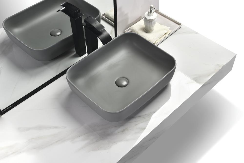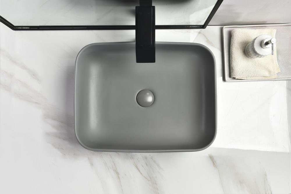 Matte Gray Ceramic Vessel Sink – Elevate your bathroom with a sleek rectangular vessel that floats above the counter, freeing up under-sink storage while turning every wash into a modern ritual. Crafted from premium ceramic with a scratch- and fade-resistant matte gray finish, this sink blends contemporary edge with timeless durability. Easy to clean, easy to love—pop-up drain sold separately.